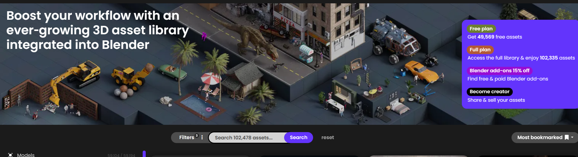 BlenderKitは、Blender専用の無料/有料アセットライブラリを直接Blender内で利用できるアドオンです。素材を探すために外部サイトを開いたり、ダウンロードしてインポートする手間を省き、ワンクリックでモデルやマテリアルをシーンに追加できます。
