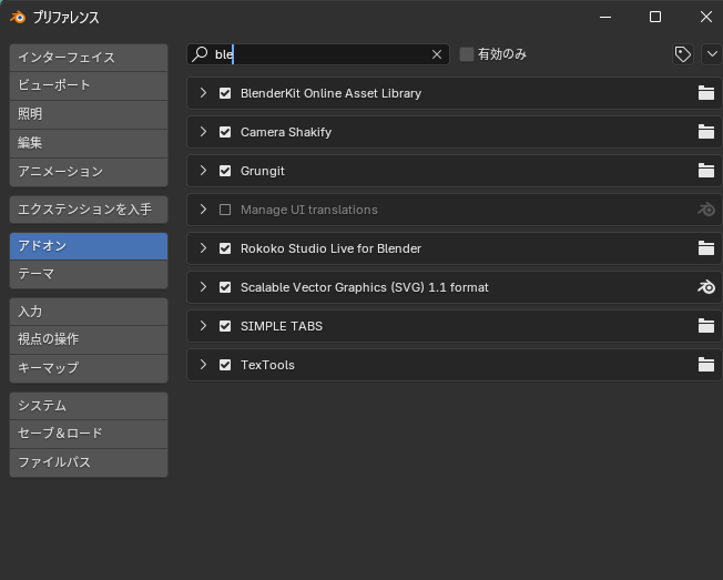 • 「編集」→「プリファレンス」→「アドオン」→BlenderKit Online Asset Libraryを検索して有効化。