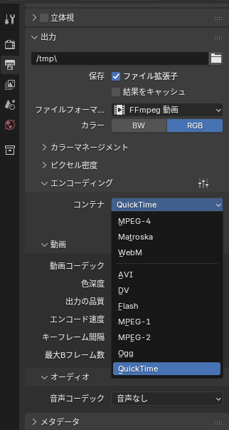 • これにより、Blenderから直接「YouTubeにそのままアップできる.mp4」や「編集ソフトに持ち込む.mov」を生成できる。