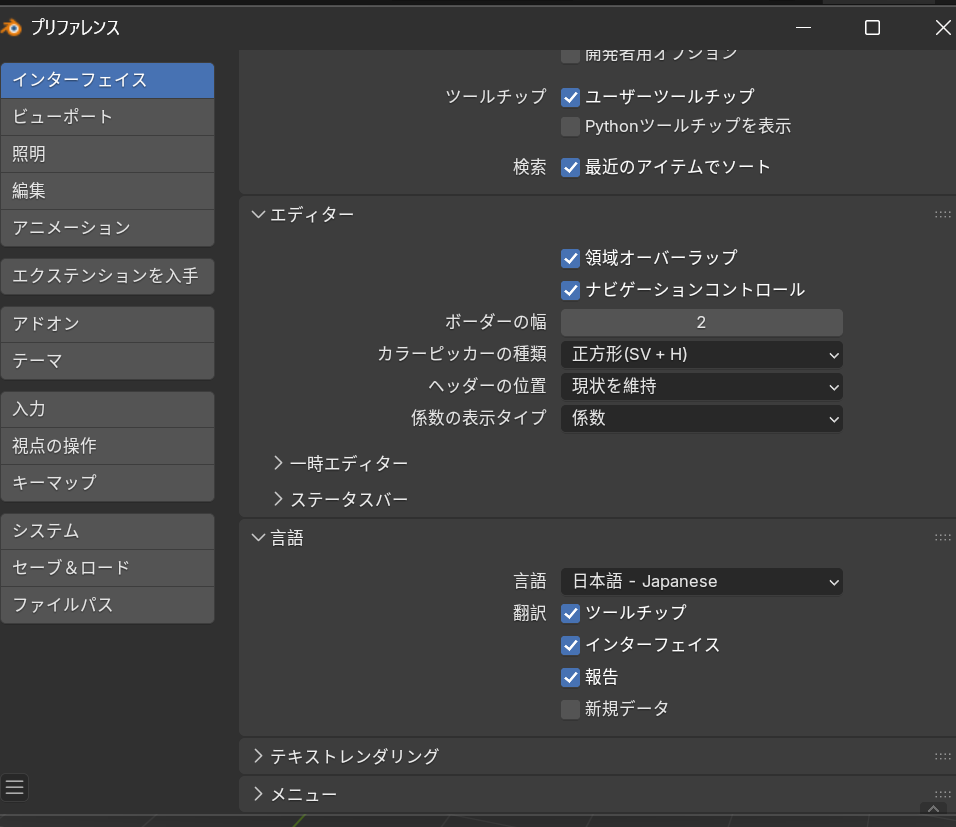 設定を日本語にしたい時の対処法 未分類 2025.10.02 Blenderで設定を日本語にしたい時の対処法 Edit→Preference→Interface→Translation→Language→日本語